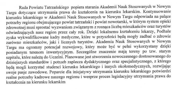 - 16 września wpłynęła prośba dr Bianki Godlewskiej-Dzioboń, rektora ANS o poparcie kontynuacji kierunku lekarskiego na tej uczelni. Apeluje o wystosowanie takiego listu do ministra nauki Dariusza Wieczorka oraz o poparcie Rady Powiatu Tatrzańskiego. Szeroko uzasadnia ona problem kontynuacji kształcenia na tym kierunku - począwszy od zaszłości historycznych regionu w rozwoju szpitalnictwa i opieki medycznej, poprzez potrzeby jakie generuje rynek pracy związany chociażby z obsługą ruchu turystycznego na terenie naszego miasta, powiatu nowotarskiego i tatrzańskiego. Zobowiązuje się również do dostosowania się do wszelkich uwag po kontroli przeprowadzonej przez Państwową Komisję Akredytacyjną przy ministrze nauki - mówiła naczelnik wydziału edukacji Anna Król-Józaga.