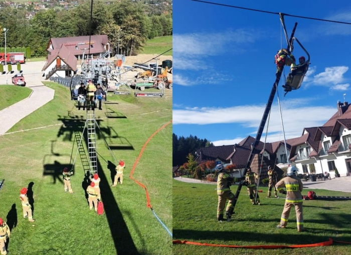 Strażacy ćwiczyli między innymi ewakuację osób z wykorzystaniem drabiny wysuwnej z drążkami podporowymi oraz wykorzystaniem technik alpinistycznych.