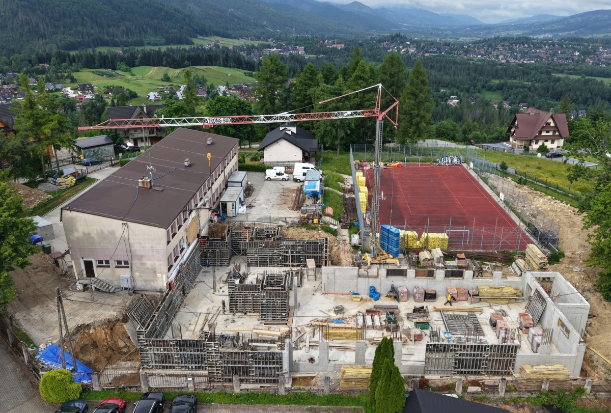 Rozebrano północne skrzydło dotychczasowego budynku, by zrobić miejsce pod nową infrastrukturę. Prace ziemne zostały zakończone, a konstrukcja przyszłej sali już wyraźnie pnie się w górę. To wyraźny sygnał, że inwestycja nabiera tempa.