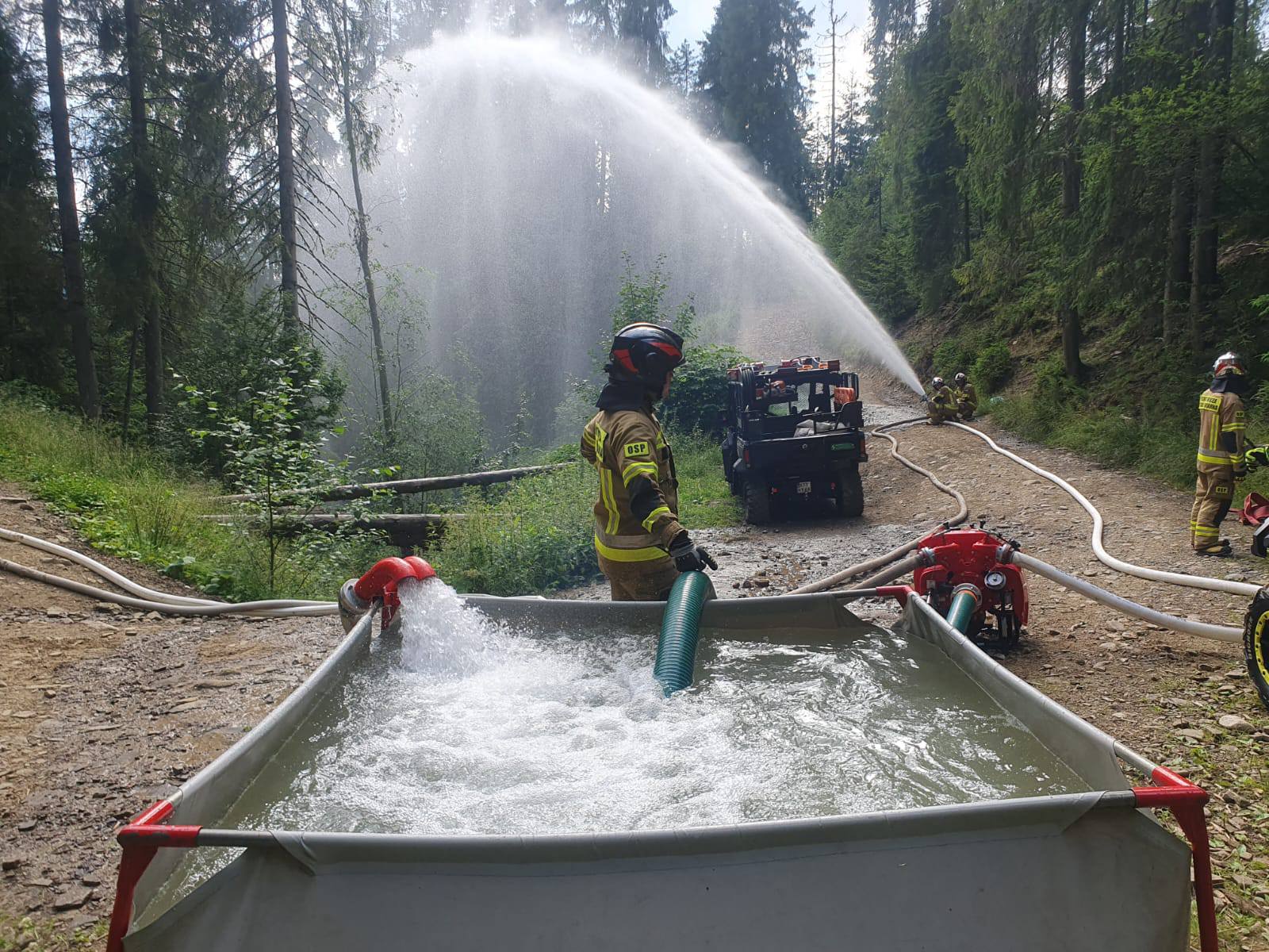 Kilka dni temu strażacy z powiatu nowotarskiego układali 400 metrów magistrali. Teraz druhowie z powiatu tatrzańskiego zbudowali system zaopatrzenia wodnego składającego się z dwóch linii wężowych na odległość ok 1500 merów. Łatwe to nie było, bo węże poprowadzono wąską drogą biegnącą przez las.