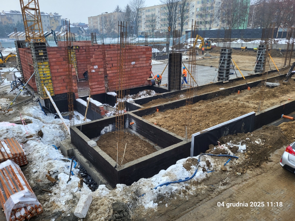 Na obecnym etapie prowadzone są prace fundamentowe - wykonano ławy i ściany fundamentowe, a w części obiektu rozpoczęto murowanie pierwszych kondygnacji ścian zewnętrznych. W obrębie przyszłej sali gimnastycznej kontynuowane są zaawansowane roboty ziemne wraz ze wznoszeniem ścian z bloczków ceramicznych, montaż i zbrojenie pionowych słupów konstrukcyjnych.