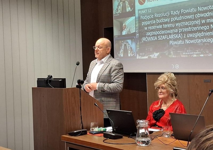 Rada Powiatu Nowotarskiego wyraża pełne poparcie dla realizacji inwestycji pn. "Budowa obwodnicy Nowego Targu w ciągu DK49" w wariancie przebiegającym w rezerwie terenu wyznaczonej w Miejscowym Planie Zagospodarowania Przestrzennego NOWY TARG 26 (RÓWNIA SZAFLARSKA). Jednocześnie Rada Powiatu Nowotarskiego uznaje za niezbędne dla ochrony interesu społecznego, przyrodniczego i gospodarczego regionu uwzględnienie w procesie projektowym i realizacyjnym uwag zgłoszonych przez Zarząd Powiatu Nowotarskiego w toku postępowania o wydanie decyzji o środowiskowych uwarunkowaniach.