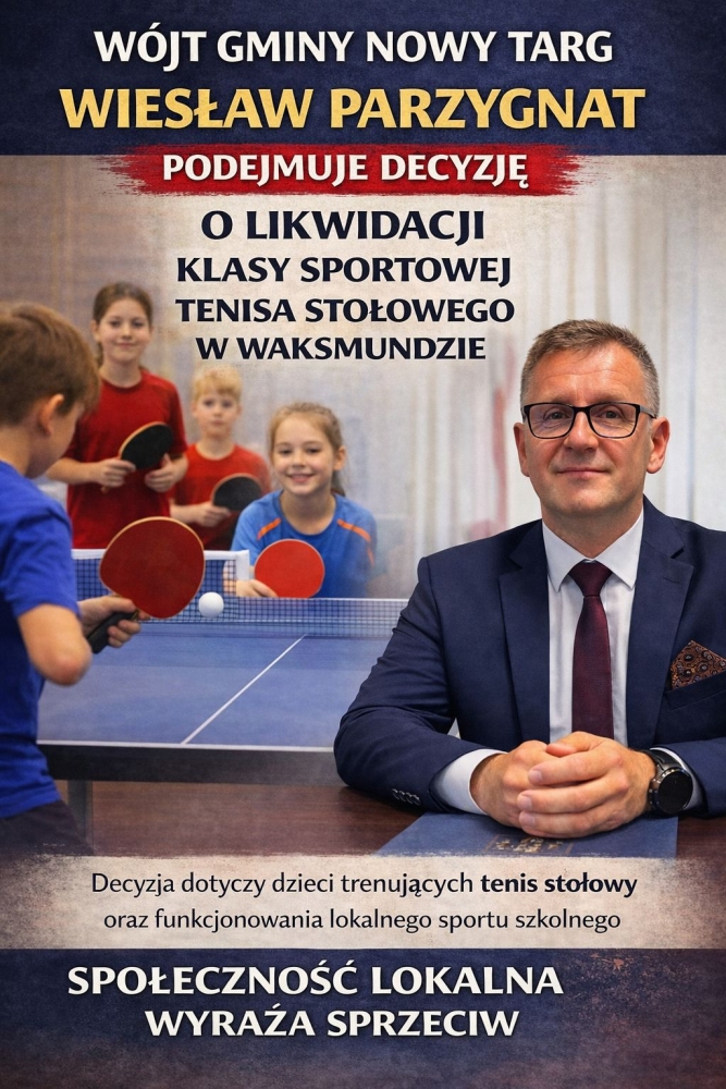 Autor pisze wprost: "Wójt gminy Nowy Targ, Wiesław Parzygnat, podjął decyzję o likwidacji klasy sportowej o profilu tenisowym w Szkole Podstawowej w Waksmundzie. Nie ma na to naszej zgody! Decyzja została podjęta bez dialogu z lokalną społecznością oraz bez uwzględnienia głosu rodziców, szkoły i środowiska sportowego. Nie oszczędzajmy na zdrowiu i rozwoju naszych dzieci" - czytamy we wpisie.