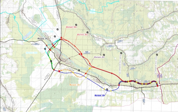 Planowane przebiegi różnych wersji obwodnic Czarnego Dunajca