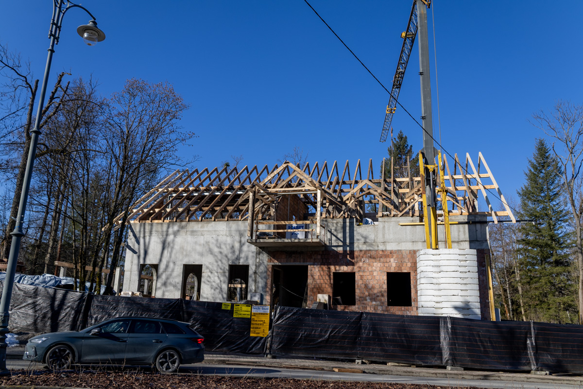 Obecnie na budowie panuje ruch. Robotnicy, po zakończeniu prac przy konstrukcji dachu, koncentrują się na kolejnych etapach, aby jak najszybciej zamknąć bryłę obiektu. Inwestor nie zwalnia tempa, dbając o to, by budynek wiernie oddawał charakter swojego historycznego pierwowzoru.