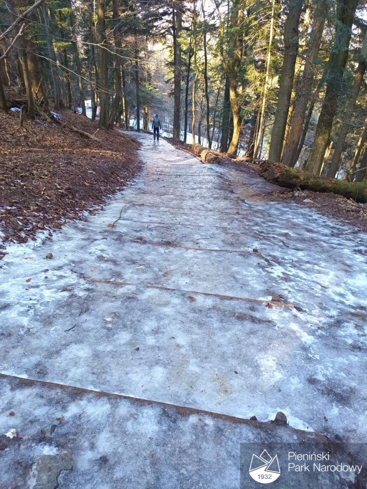 "Szlaki w wyższych partiach gór są mocno oblodzone. Występuje konieczność użycia sprzętu asekuracyjnego, takiego jak raczki oraz kije trekkingowe" - informuje park.
