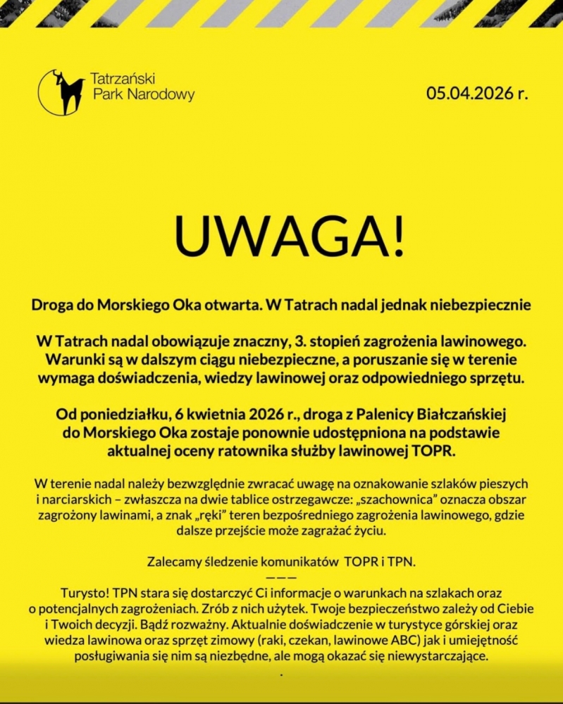 Droga do Morskiego Oka otwarta. W Tatrach nadal jednak niebezpiecznie - podhale24.pl
