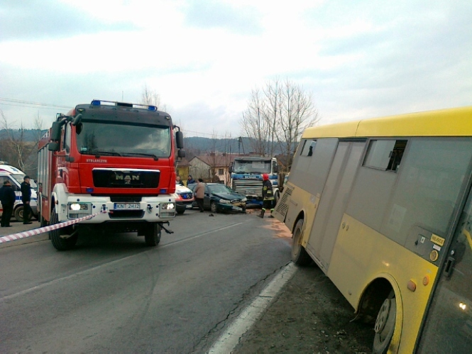 Ze wstępnych ustaleń policji wynika, że wjeżdżający z ul. Waksmundzkiej do Waksmunda osobowy ford mondeo wjechał pod autobus MZK, w którego tył uderzyła z kolei ciężarowa scania. W wypadku ucierpiało dziewięć osób. Stan rannych na razie nie jest znany, ale - jak relacjonuje Podhale24 Roman Wolski, rzecznik Komendy Powiatowej Policji w Nowym Targu - ich życiu nie zagraża niebezpieczeństwo. Na miejscu wypadku wciąż pracują policjanci i strażacy.
