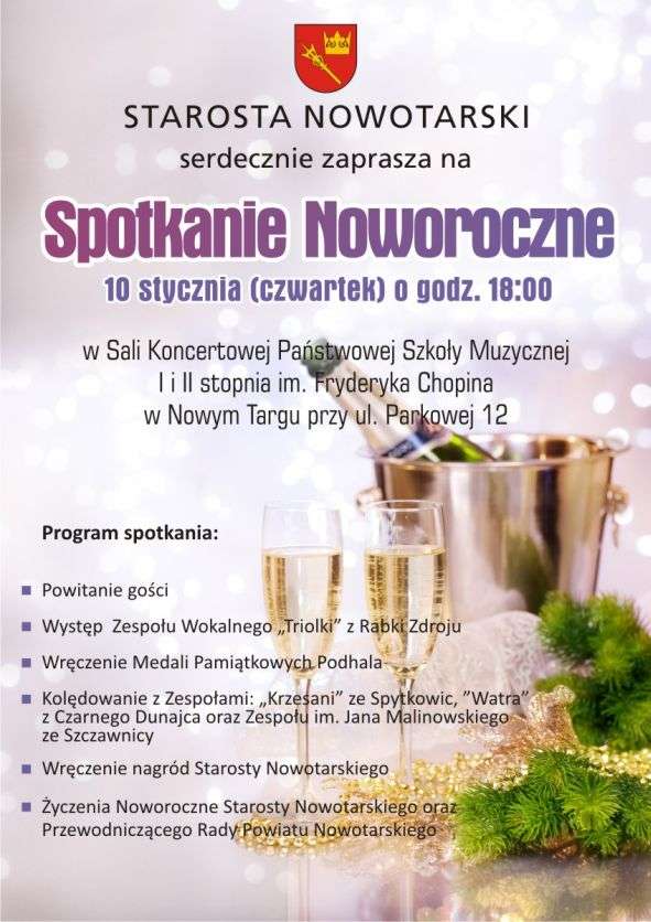 Wieczór uświetni występ zespołów: "Triolki" z Rabki-Zdroju, "Krzesanych" ze Spytkowic, "Watry" z Czarnego Dunajca oraz Zespołu im. Jana Malinowskiego ze Szczawnicy. W programie - wspólne kolędowanie, życzenia noworoczne oraz wręczenie nagród starosty.
