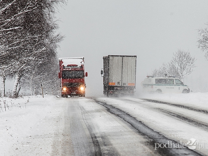 Na drogach podtatrzańskich leży kilkucentymetrowa warstwa śniegu. W wielu miejscach drogi są zablokowane przez ciężarówki, które utknęły w zaspach.