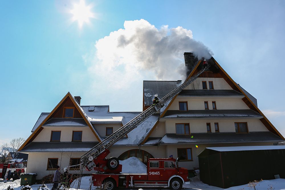 Do gaszenia pożaru w pensjonacie przyjechało kilkanaście jednostek straży pożarnej. Budynek jest wysoki, dlatego w akcji strażacy użyli długiego wysięgnika.
