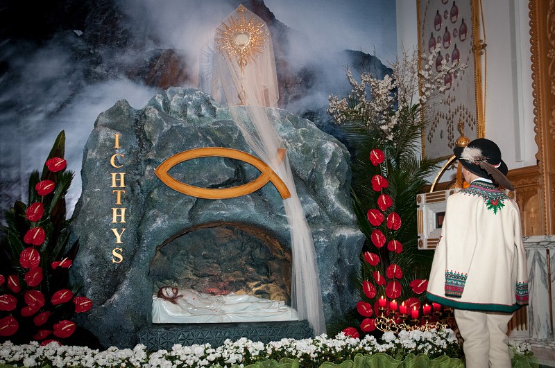 Zgodnie z obyczajem przy symbolicznym grobie czuwa warta - ministranci, harcerze, strażacy w galowych mundurach, a na Podhalu górale w strojach regionalnych.