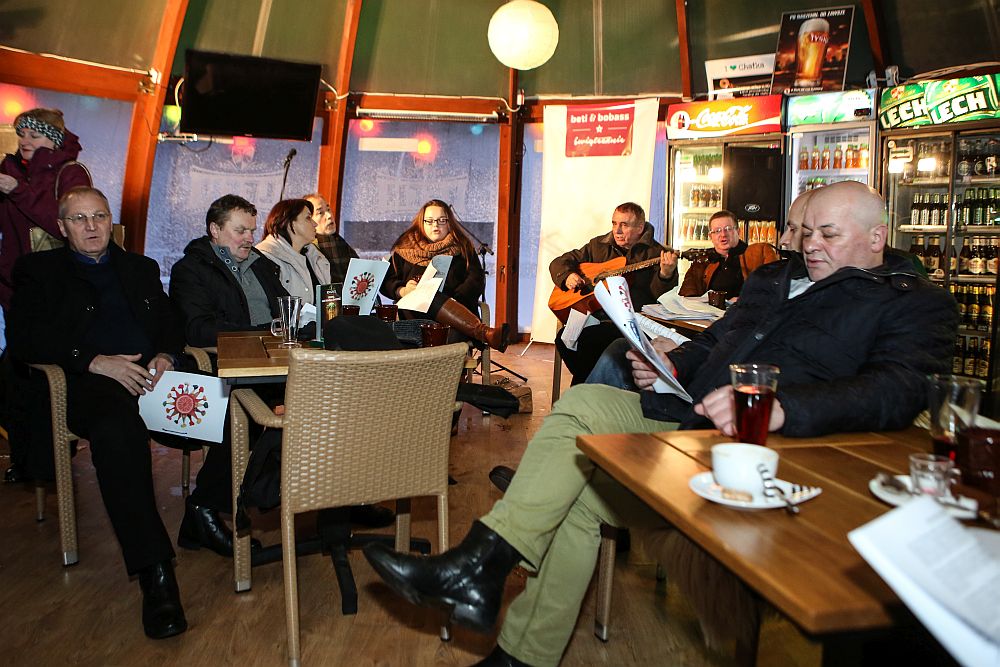 Wspólne śpiewanie samorządowców powoli staje się nowotarską tradycją. Podobne spotkanie odbyło się bowiem po raz kolejny. Tym razem jednak pogoda wymusiła małą zmianę. Padający śnieg sprawił, że "kolędnicy" zamiast na scenie - spotkali się w zaciszu jednego z lokali na płycie Rynku.
