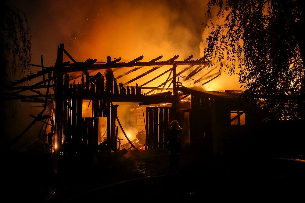 Budynek gospodarczy cały jest w ogniu. Strażacy nie są już w stanie go uratować. Pali sie też sprzęt rolniczy, który jest w środku. Pożar przeniósł się też na dom mieszkalny. Oba budynki są ze sobą połączone. Z domu wydobywa się dym.