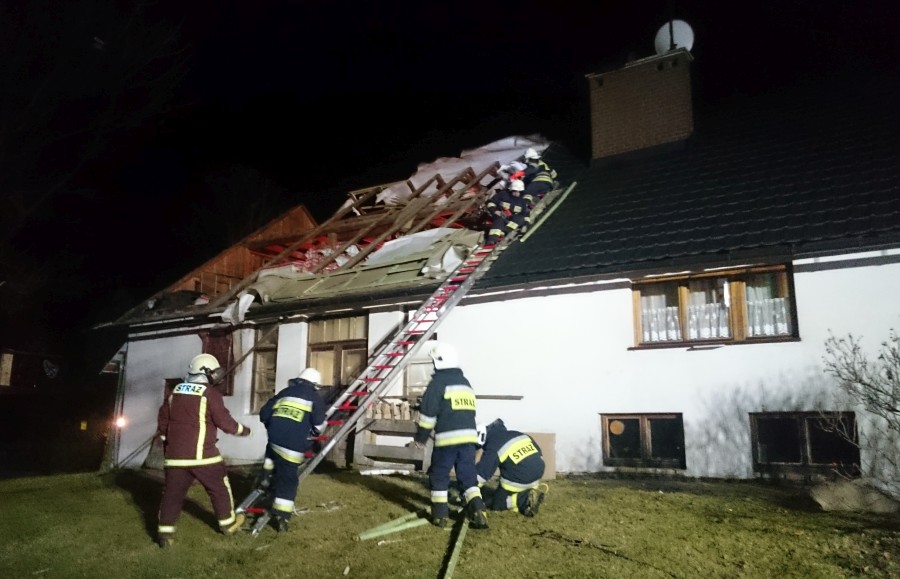 Na miejscu są strażacy, którzy próbują zabezpieczyć odsłonięte poddasze.