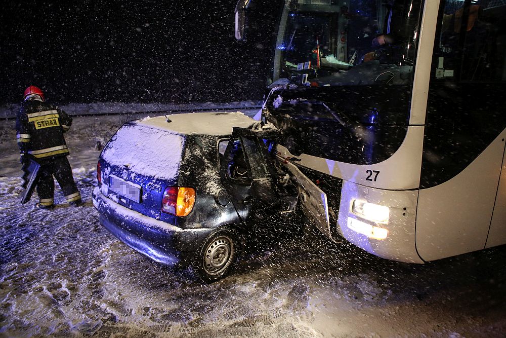 Jak wynika z ustaleń policji, kierowca samochodu osobowego wpadł w poślizg i zjechał na drugi pas jezdni, na którym zderzył się z jadącym z naprzeciwka autobusem. Żaden z pasażerów nie odniósł obrażeń. Strażacy wyciągnęli z samochodu jedną osobę i przekazali ją załodze karetki.