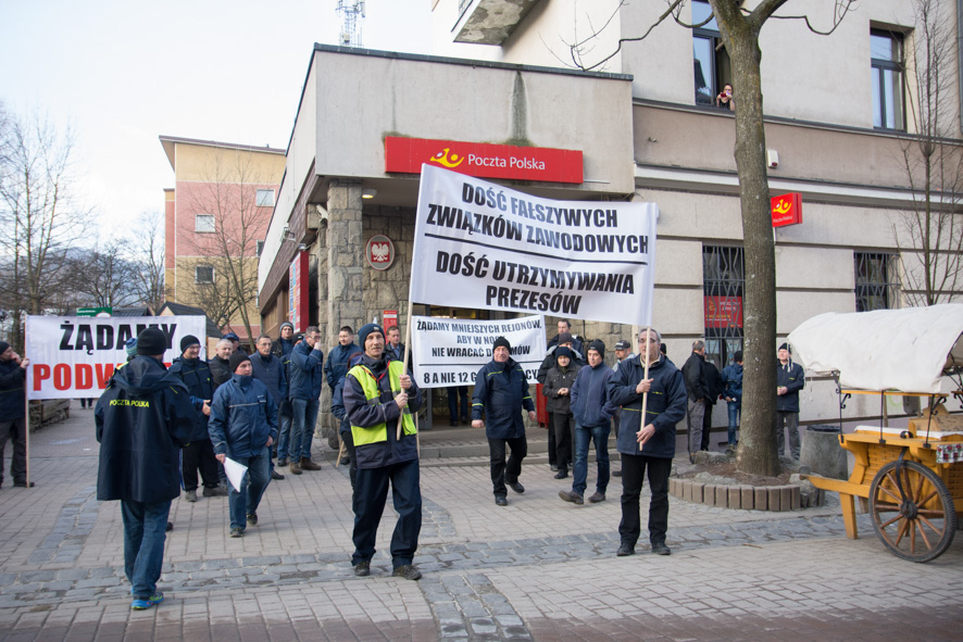 Kilkunastoosobowa manifestacja przeszła sprzed budynku Poczty Polskiej na Krupówkach do Urzędu Miasta. Protestujący wykrzykiwali hasła z żądaniami respektowania 8-godzinnego dnia pracy oraz podniesienia pensji listonoszy.