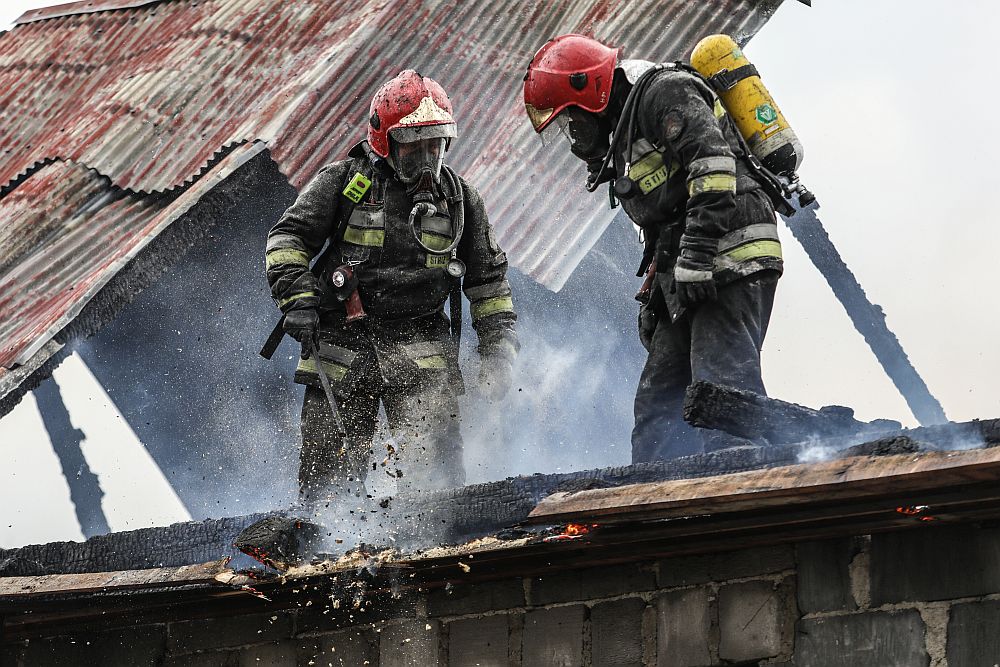 Pożar został już opanowany. Strażacy rozbierają dach, żeby przelać miejsca, z których wydobywa się dym.