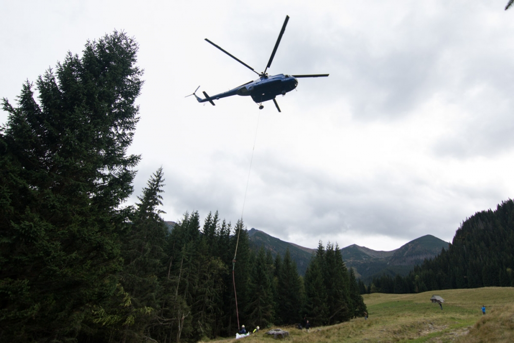 Trudno dostępny teren wykluczył możliwość tradycyjnego transportu nagromadzonych śmieci na dół. Worki z odpadami podczepiano do trzydziestometrowej liny, która gwarantowała większe bezpieczeństwo. – Praca na tak dużej linie zwiększa bezpieczeństwo śmigłowca. Nie ma też obawy uszkodzeń w drzewostanie. Zapewni to także bezpieczeństwo remontowanego dachu schroniska na Kalatówkach. Stąd taka długość liny i wysokość śmigłowca nad ziemią – mówi Masewicz.