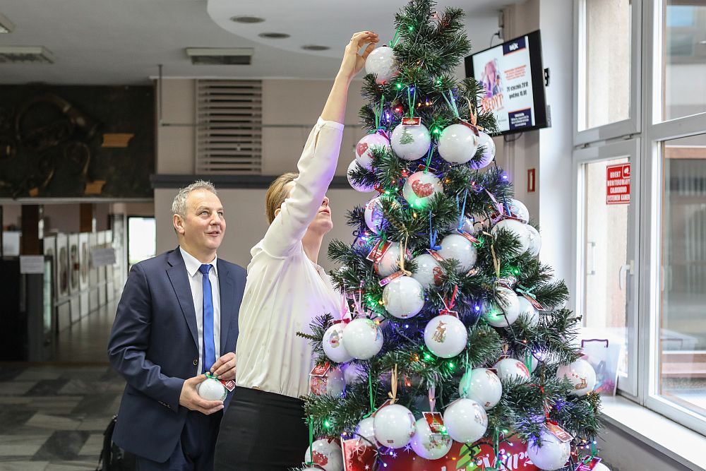 Choinkę ubrali organizatorzy. Bombki wieszali m.in. ks. Jan Karlak z parafii św. Jana Pawła II, starosta nowotarski Krzysztof Faber, koordynatorka akcji Anna Tylka i autorka bombek - Maria Chmielowska-Szymoniak.