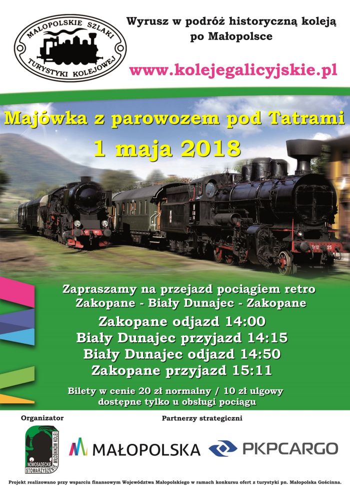 Pociąg retro odwiedzi także Nowy Targ i Zakopane. 1 maja o godzinie 13:00 wjedzie na zakopiański dworzec. Punktualnie o 14:00 wyruszy na przejażdżkę do Białego Dunajca i z powrotem.