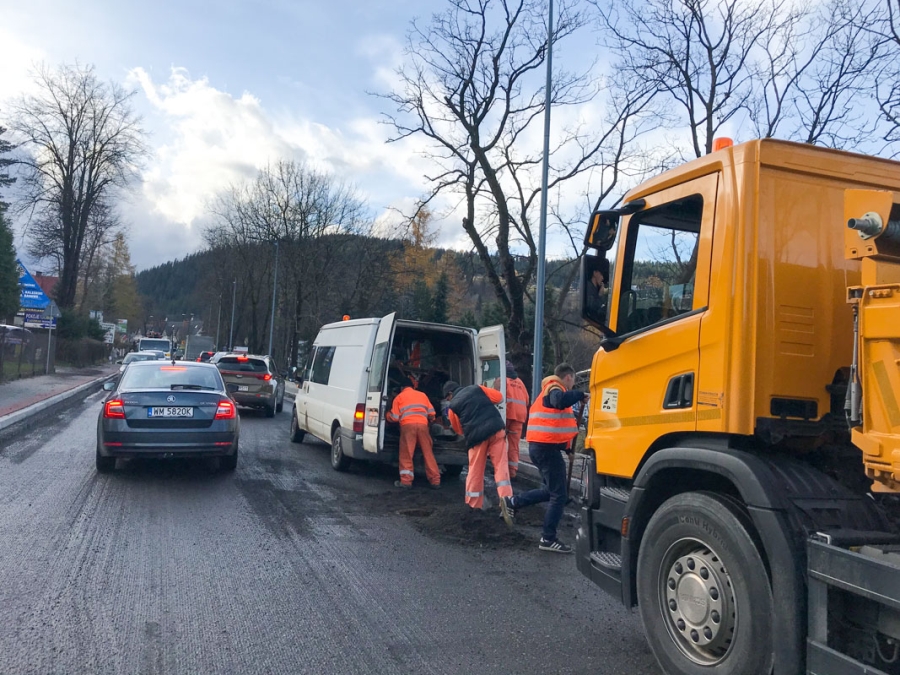 Trwają tu roboty drogowe. Nakładka asfaltowa na jezdni została sfrezowana, drogowcy prowadzą prace na poboczu. Wprowadzony został ruch wahadłowy, co powoduje spore korki.