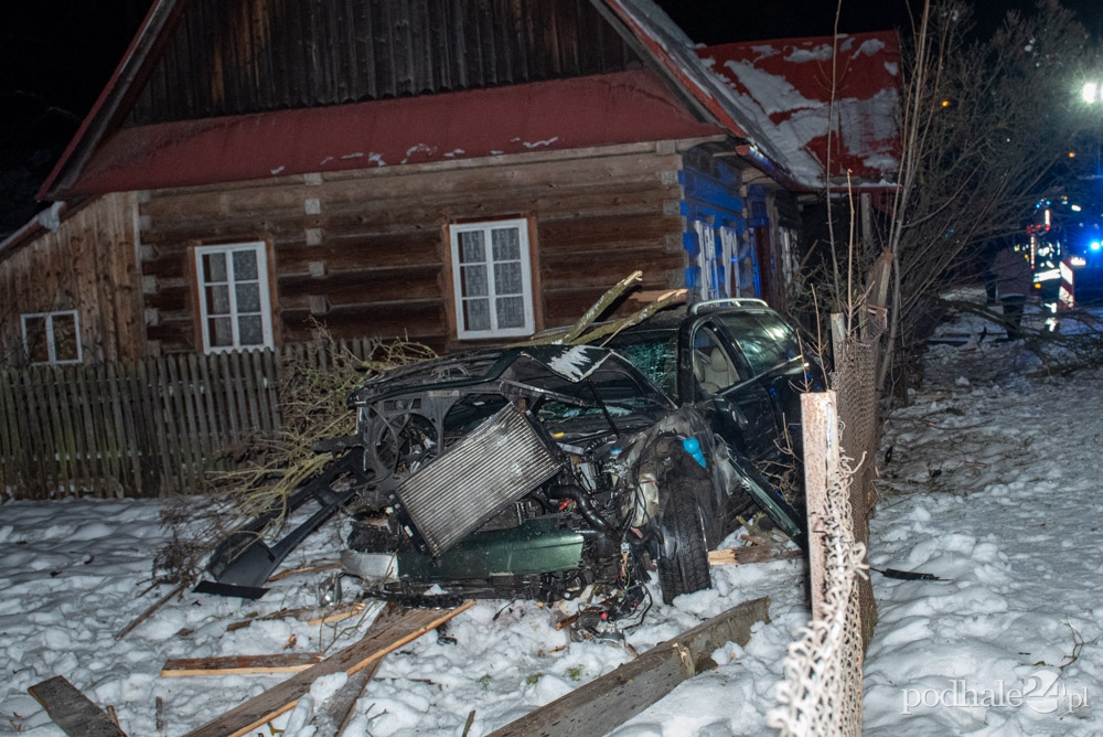 Kierujący samochodem osobowym zjechał z drogi, staranował ogrodzenie i uderzył w drewniany dom, uszkadzając go. Zatrzymał się dopiero za domem. Według świadków zdarzenia kierujący mógł być pod wpływem alkoholu. Został zabrany do szpitala. Na miejscu pracują służby.