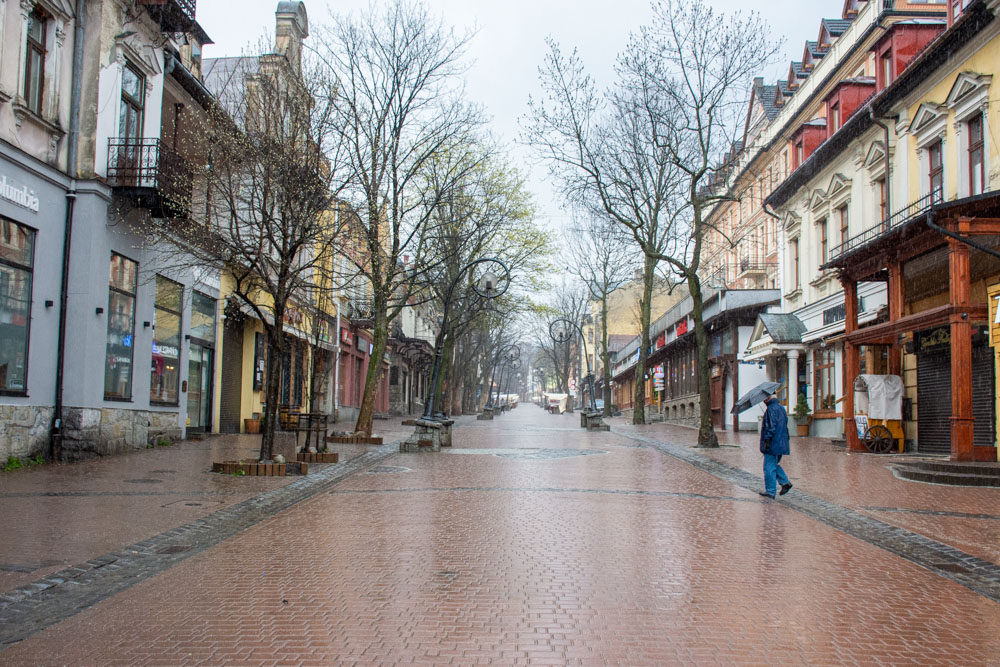 Na mieście pusto i spokojnie, Na Krupówkach pojawiają się pojedyncze osoby robiące zakupy. Pootwierane są niektóre sklepy odzieżowe czy obuwnicze. Jest też czynnych kilka lokali gastronomicznych oferujących sprzedaż na wynos. Otwarte też są sklepiki z pamiątkami - sprzedawcy widocznie liczyli na turystów.
