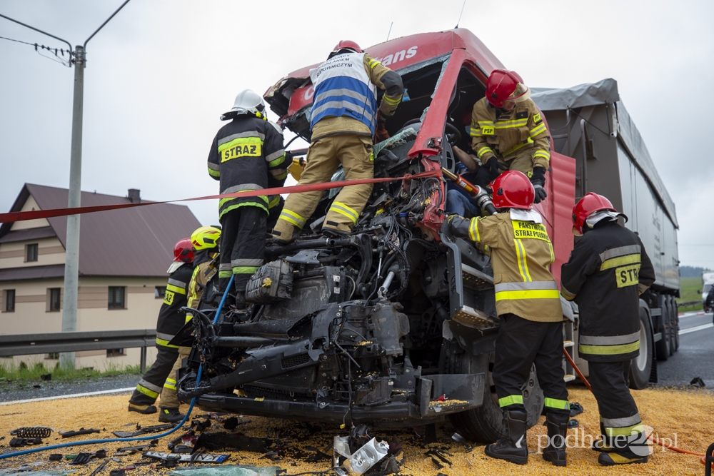 Siła uderzenie musiała być duża, gdyż ciężarówka, która najechała na naczepę, jest mocno zniszczona. W wyniku uderzenia w środku został zakleszczony kierowca. Z pomocą ruszyli mu strażacy. Na miejscu pracuje straż pożarna, policja i pogotowie ratunkowe.