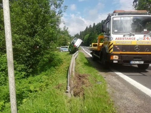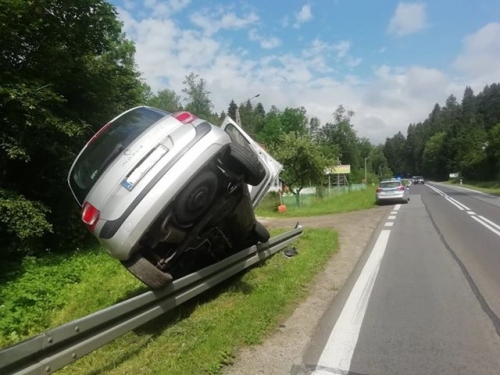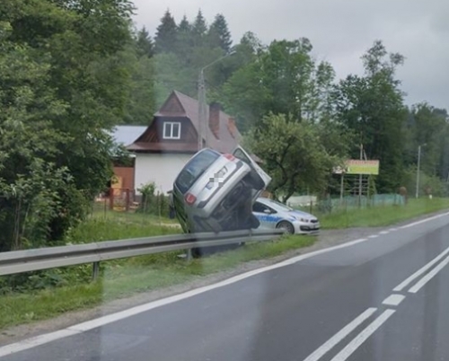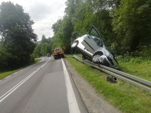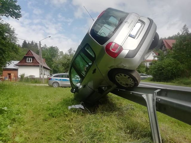 Kierowca samochodu osobowego marki Renault stracił panowanie nad autem, wypadł z drogi i zawisł na barierkach.