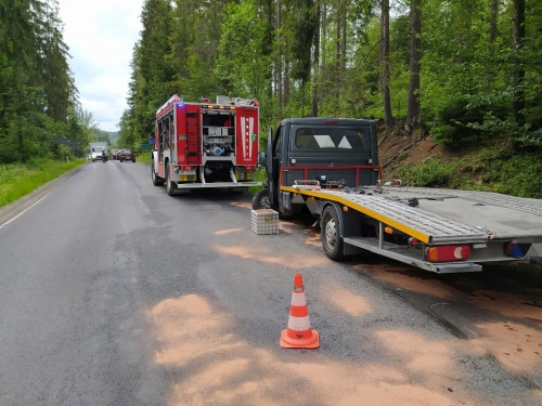 Kierująca samochodem osobowym z niewiadomych przyczyn zjechała ze swojego pasa drogi i uderzyła w nadjeżdżającą z naprzeciwka lawetę. Na nią z kolei najechało inne auto.