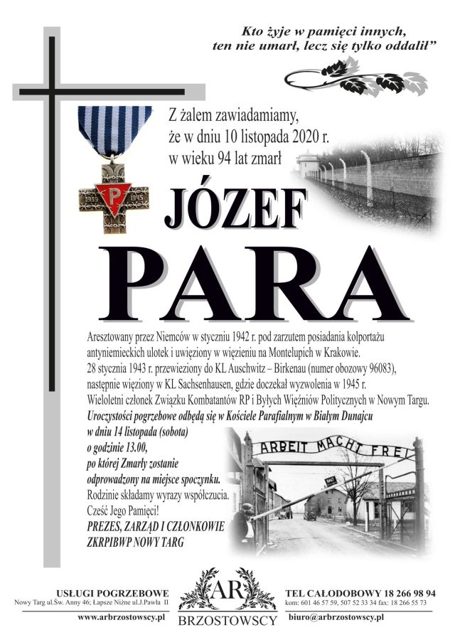 W 1941 r. zostałem wywieziony do Bolkowic koło Brześcia Litewskiego, gdzie pracowałem przymusowo przy obiektach wojskowych w firmie organizacji Todt. Końcem sierpnia zachorowałem na tyfus i zwolniono mnie do domu. W drugiej połowie 1942 r. mój starszy brat Stanisław, który był w organizacji konspiracyjnej (w 1944 r. został rozstrzelany przez Gestapo w Kuźnicach). Dawał różne zadania, jak dostarczać korespondencje do wsi Gliczarów Górny, Leśnica i inne przysiółki. W styczniu 1943 r. zostałem aresztowany przez Gestapo (starszych braci w domu nie było) pod zarzutem kolportażu anty niemieckich ulotek oraz podejrzany o nielegalne posiadanie broni. Po krótkim pobycie w więzieniu na Montelupich w Krakowie, gdzie mimo bicia mnie nie zdołano wyciągnąć ze mnie informacji, zostałem wywieziony do Obozu Koncentracyjnego w Oświęcimiu – Brzezince (J. Para przybył do KL Auschwitz 28 stycznia 1943 r., numer obozowy 96083). W marcu 1943 r. zostałem przewieziony do Obozu Sachsenhausen, gdzie w Komandzie henkiel pracowałem 2 lata. Po wyzwoleniu przez Armię Czerwoną wróciłem do domu, gdzie pracowałem razem z ojcem na gospodarstwie. Służbę wojskową odbyłem w latach 1947 – 1949. Po przyjściu z wojska w 1950 r. założyłem własną rodzinę. W latach 1951 – 1953 pracowałem w Podhalańskiej Spółdzielni Mleczarskiej w Zakopanem. W latach 1958 – 1968 pracowałem w NZPS Nowy Targ na produkcji obuwia. Od 1968 r. do chwili obecnej pracuje wyłącznie na swym gospodarstwie.”