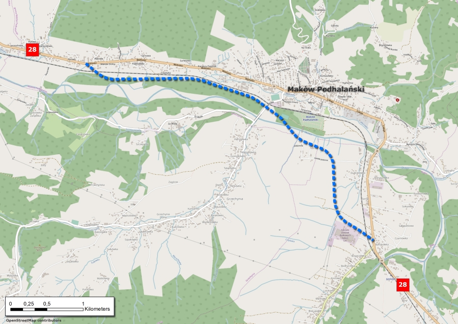 Średni ruch drogowy na odcinku drogi krajowej nr 28 przebiegającej przez miasto Maków Podhalański, zgodnie z pomiarami z roku 2015, wynosi 12 865 poj./dobę. Tak duże natężenie ruchu wynika m.in. z faktu, że droga ta stanowi najkrótszy łącznik dla ruchu turystycznego pomiędzy Górnym Śląskiem a Zakopanem oraz przejściami granicznymi w Chyżnem na DK7 i w Jurgowie na DK49.