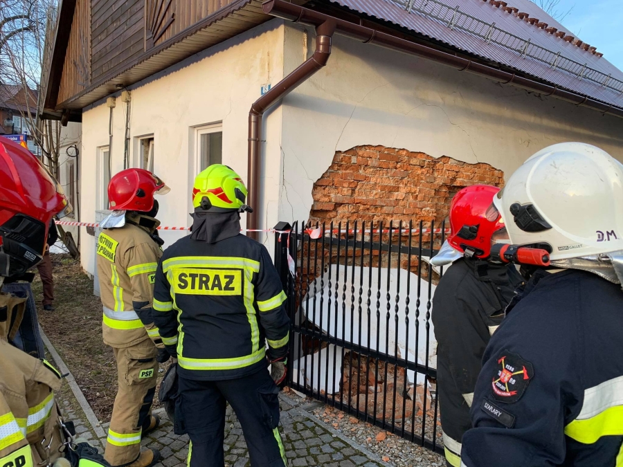 Płat ściany, tynk razem z cegłami, opadł na podwórko posesji i przejazd. Do zdarzenia zostali wezwani strażacy, którzy zabezpieczyli miejsce i zajęli się oceną potencjalnego zagrożenia. O sytuacji został powiadomiony Powiatowy Inspektor Nadzoru Budowlanego.