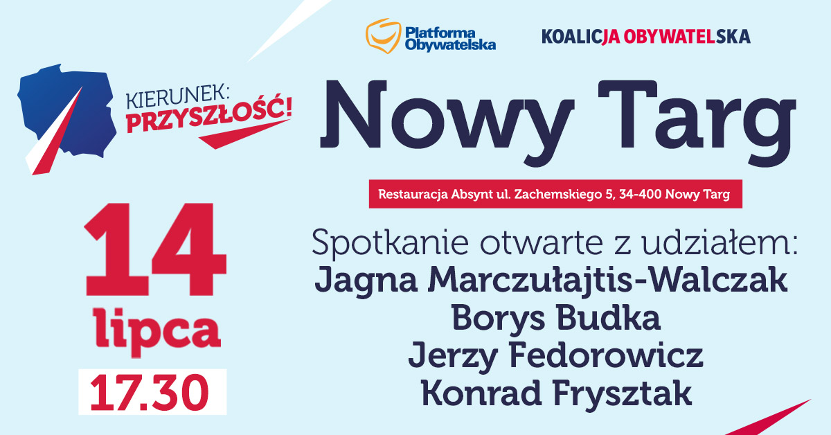 Najpierw politycy będą chodzić z ulotkami, a potem chcą rozmawiać o przyszłości Polski. Temat to "Kierunek przyszłość". W spotkaniu, które odbędzie się 14 lipca o godz. 17.30 w restauracji Absynt w Nowym Targu przy ul. Zachemskiego, wezmą udział: Borys Budka, Jagna Marczułajtis-Walczak, Konrad Frysztak i Jerzy Fedorowicz.