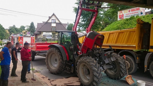 Ciągnik zahaczył o metalową konstrukcję pod przejazdem kolejowym. Na miejsce wezwano Policję i Straż Pożarną. Trwa usuwanie uszkodzonych elementów oraz czyszczenie jezdni.