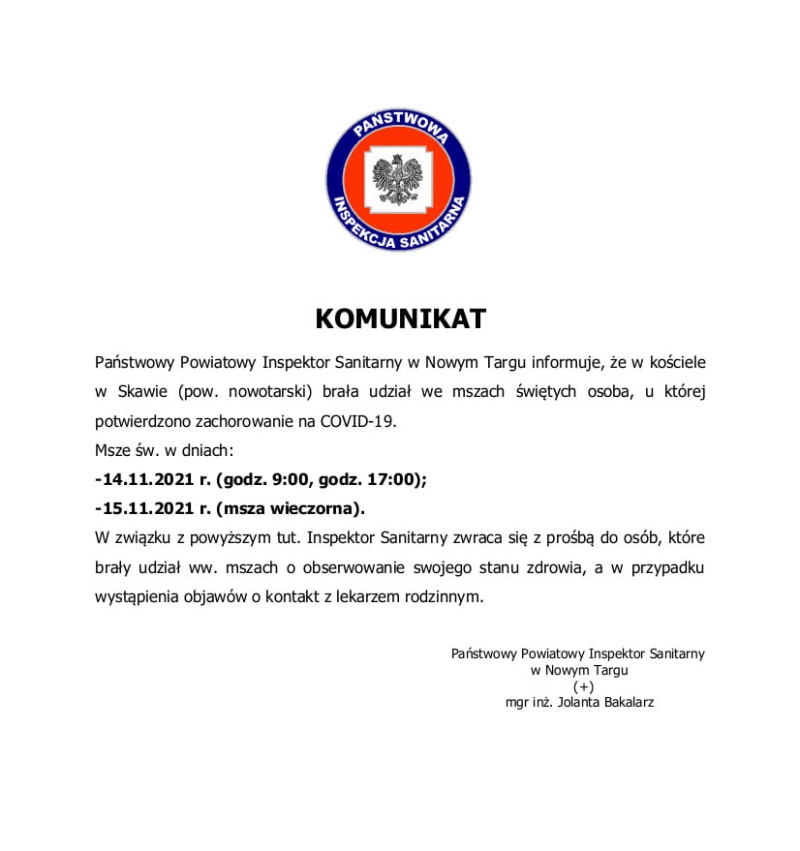Chodzi o niedzielne msze święte o godz. 9 i 17 oraz o poniedziałkową mszę wieczorną. Sanepid zwraca się do osób, które brały udział w tych nabożeństwach o obserwowanie swojego stanu zdrowia, a w przypadku wystąpienia objawów - o kontakt z lekarzem rodzinnym.