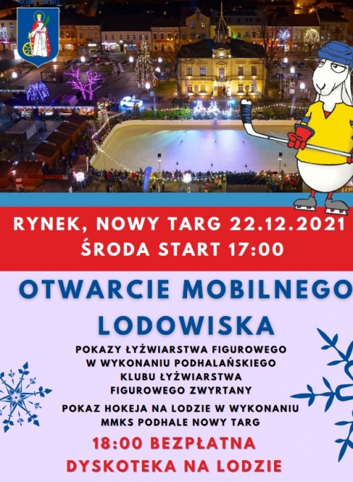 - Rozpoczniemy pokazami łyżwiarstwa figurowego w wykonaniu Podhalańskiego Klubu Łyżwiarstwa Figurowego "Zwyrtany" oraz hokeistów z MMKS Podhale Nowy Targ. Od godziny 18.00 rozpocznie się bezpłatna Dyskoteka na Lodzie. Zapraszamy na nowotarski Rynek również na trwający do 23 grudnia br. Jarmark Bożonarodzeniowy - przypomina Arkadiusz Szymczyk, kierownik Referatu ds. Sportu i Turystyki nowotarskiego UM.