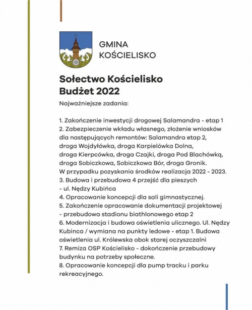 Oto najważniejsze zadania zaplanowane w poszczególnych sołectwach na 2022 rok.