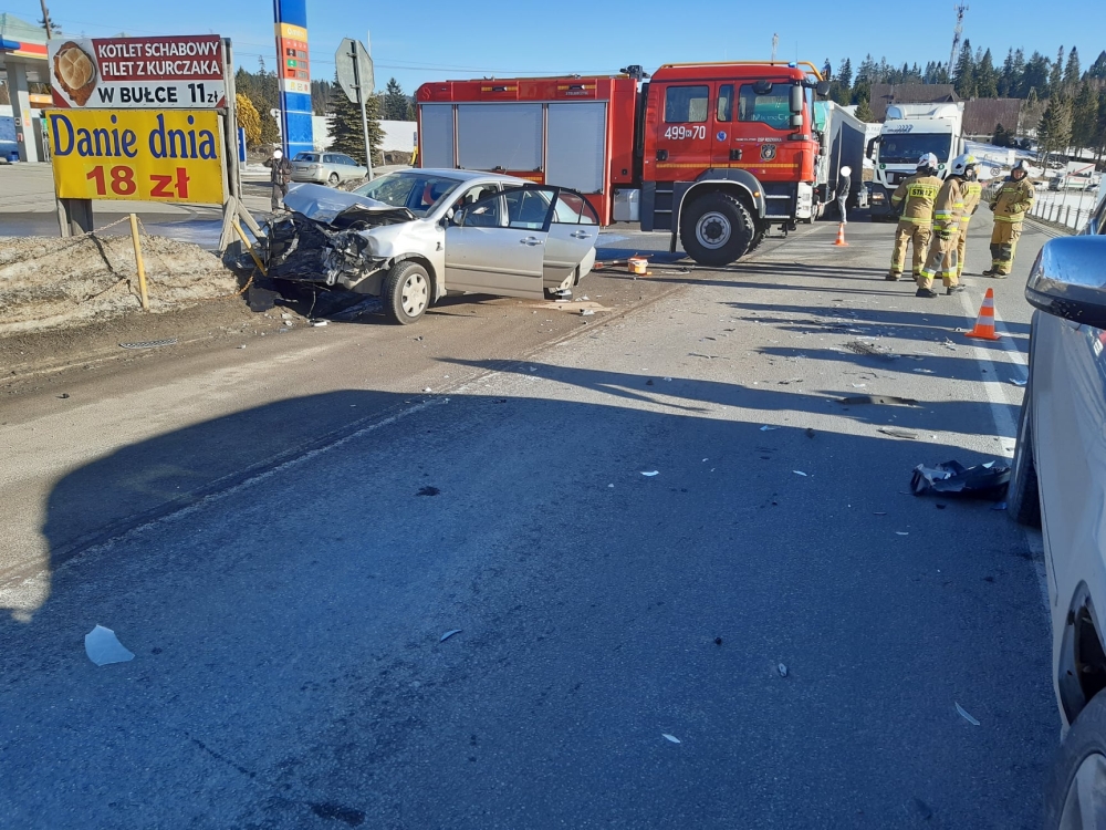 Z ustaleń nowotarskiej policji wynika, że kierowca toyoty nie ustąpił pierwszeństwa wyjeżdżając ze stacji benzynowej i i zderzył się z jeppem. Jedna osoba została przewieziona do szpitala, ale jej obrażenia okazały się niegroźne.