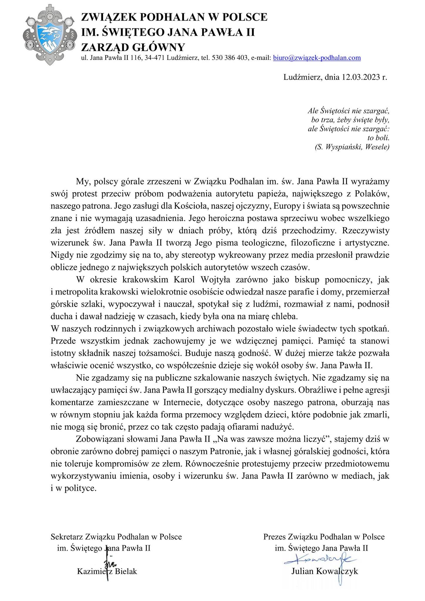 "Nigdy nie zgodzimy się na to, aby stereotyp wykreowany przez media przesłonił prawdziwe oblicze jednego z największych polskich autorytetów wszech czasów" - czytamy w oświadczeniu podpisanym przez prezesa zarządu głównego Juliana Kowalczyka i sekretarza Kazimierza Bielaka. "Nie zgadzamy się na publiczne szkalowanie naszych świętych. Nie zgadzamy się na uwłaczający pamięci św. Jana Pawła II gorszący medialny dyskurs. Obraźliwe i pełne agresji komentarze zamieszczane w Internecie, dotyczące osoby naszego patrona, oburzają nas w równym stopniu jak każda forma przemocy względem dzieci, które podobnie jak zmarli, nie mogą się bronić, przez co tak często padają ofiarami nadużyć".