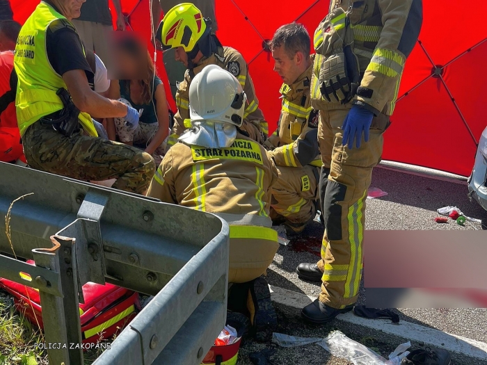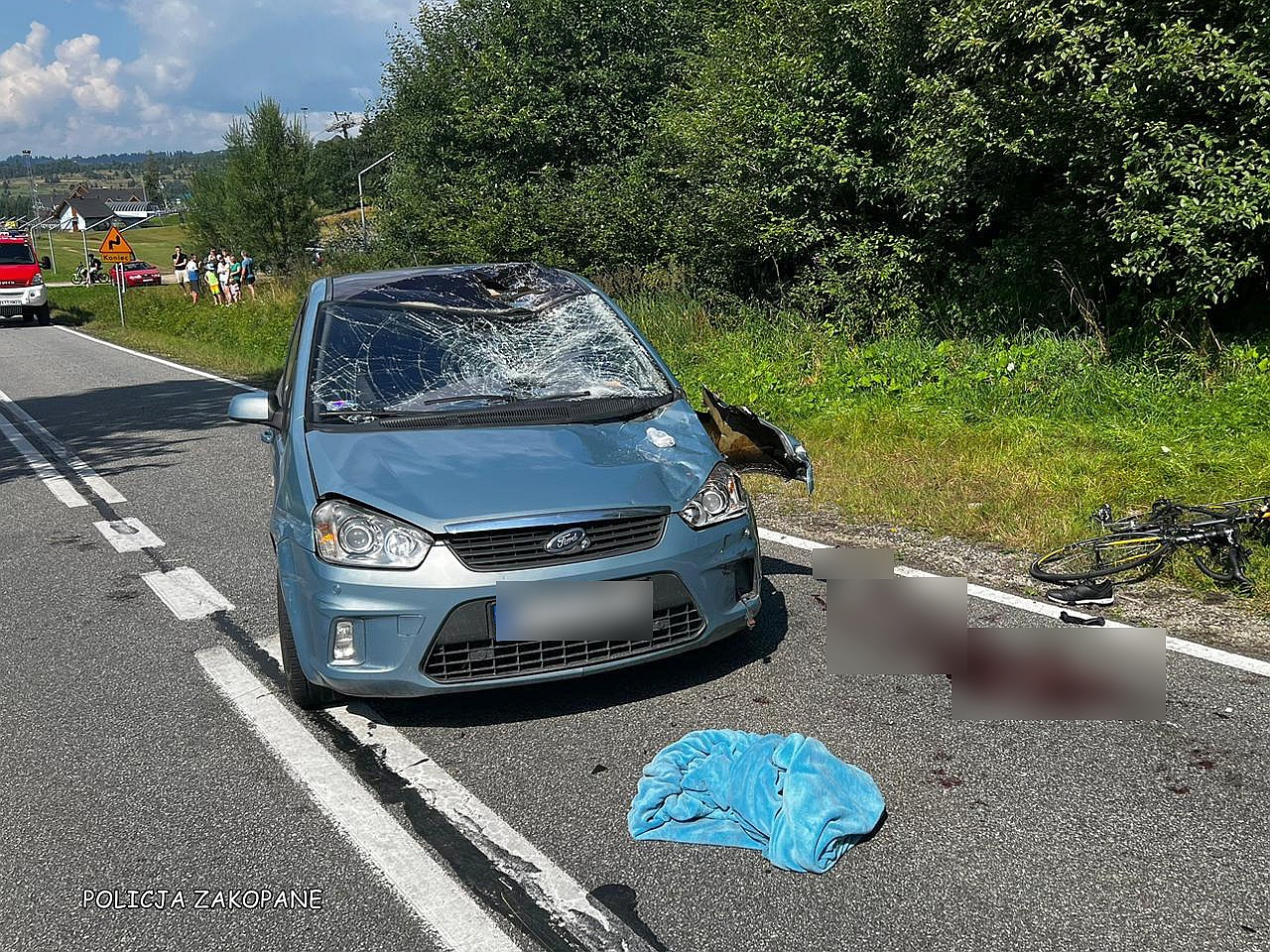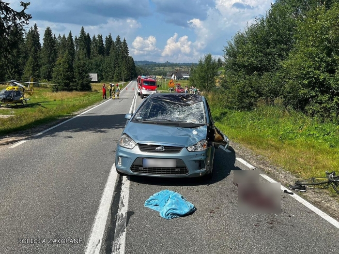 Tatrzańscy policjanci odebrali zgłoszenie, iż na leśnym odcinku drogi samochód osobowy nagle zjechał na przeciwny pas i uderzył w jadącego z przeciwka rowerzystę. W wyniku zderzenia 60-letni rowerzysta z woj. podkarpackiego doznał poważnych obrażeń ciała. Na miejscu bardzo szybko pojawiły się służby ratunkowe oraz policjanci. Ratownicy prowadzili czynności ratujące życie poszkodowanego rowerzysty, a policjanci przystąpili do zabezpieczenia miejsca zdarzenia oraz wyjaśniania okoliczności i przyczyn wypadku. Koniecznym było wezwanie na miejsce Lotniczego Pogotowia Ratunkowego, które przetransportowało poszkodowanego do specjalistycznego szpitala w Krakowie.
