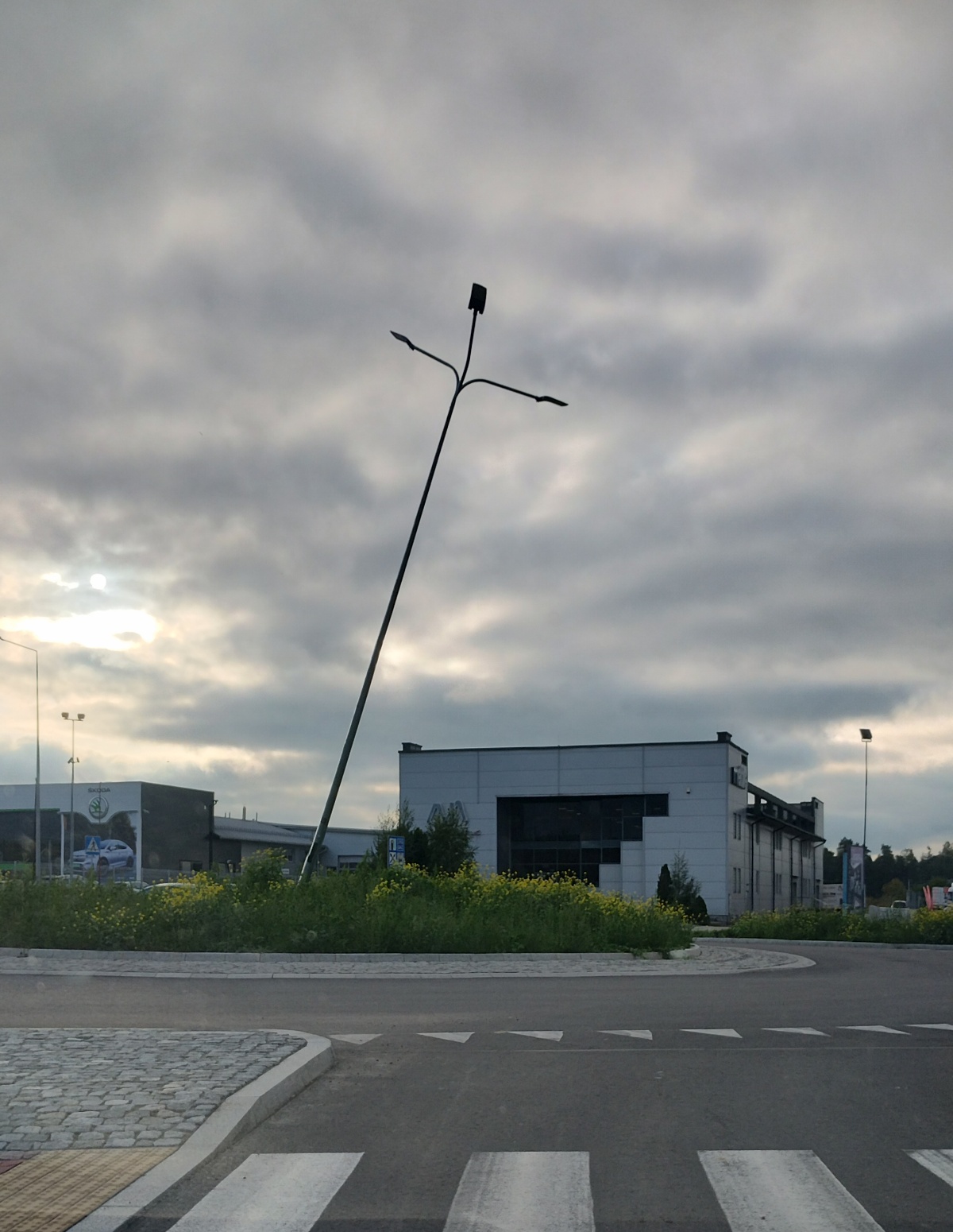 Lampa stoi na środku nowo wybudowanego ronda koło Decathlonu. - Jest mocno pochylona. Na rondzie widać ślady, przeorany kawałek, jakby jakiś samochód wjechał i uderzył w latarnię. Tak czy siak trzeba coś z nią zrobić, żeby nie zwaliła się na drogę lub przejeżdżające auto - mówi czytelnik.