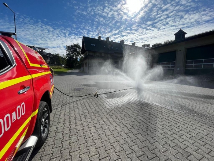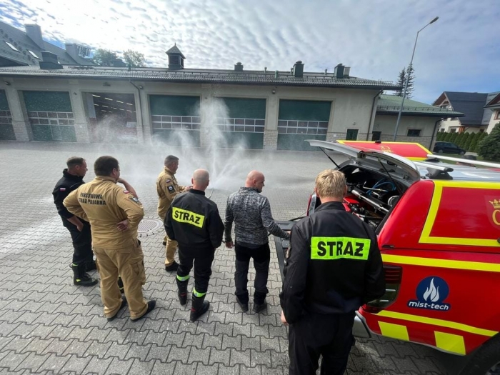 ZAKOPANE. Obok Komendy Powiatowej PSP zorganizowany został pokaz sprzętu do chłodzenia oraz gaszenia pojazdów elektrycznych.