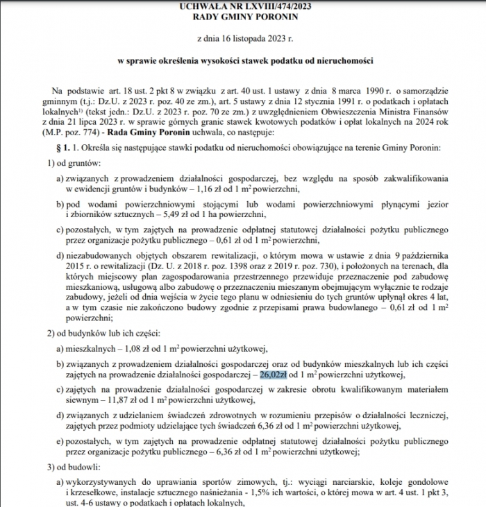Od 1 stycznia 2024 roku mieszkańcy zapłacą m.in.: 1,16 zł za m.kw. powierzchni od gruntów zajętych na prowadzenie działalności gospodarczej (dotychczas było 1,05 zł), od pozostałych gruntów - 0,61 zł za m.kw. powierzchni (było 4,99 zł), 1,08 zł za m.kw. powierzchni użytkowej od budynków mieszkalnych (dotychczas było 0,98 zł), 26,02 zł od budynków lub ich części zajętych na prowadzenie działalności gospodarczej (było 23,65 zł).