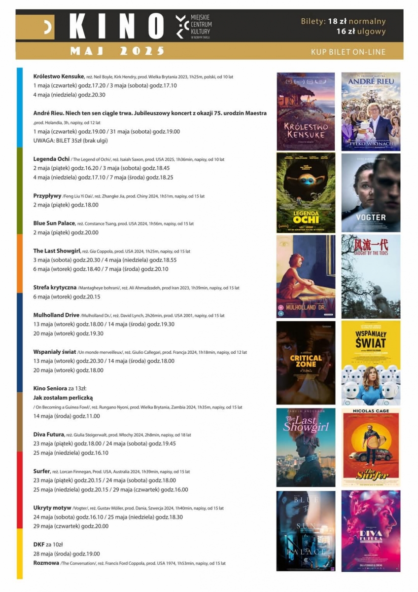 Filmy festiwalowe (Przypływy, Blue Sun Palace, Strefa krytyczna), filmy dla całych rodzin (Królestwo Kensuke, Legenda Ochi, Wspaniały świat), filmy z głośnymi powrotami (The Last Showgirl, Mulholland Drive, Surfer, Rozmowa), ciekawostki ze świata (Diva Futura, Ukryty motyw). Bilety: 16zł ulgowe i 18zł normalne. Bądźcie z nami! Szczegóły poniżej: