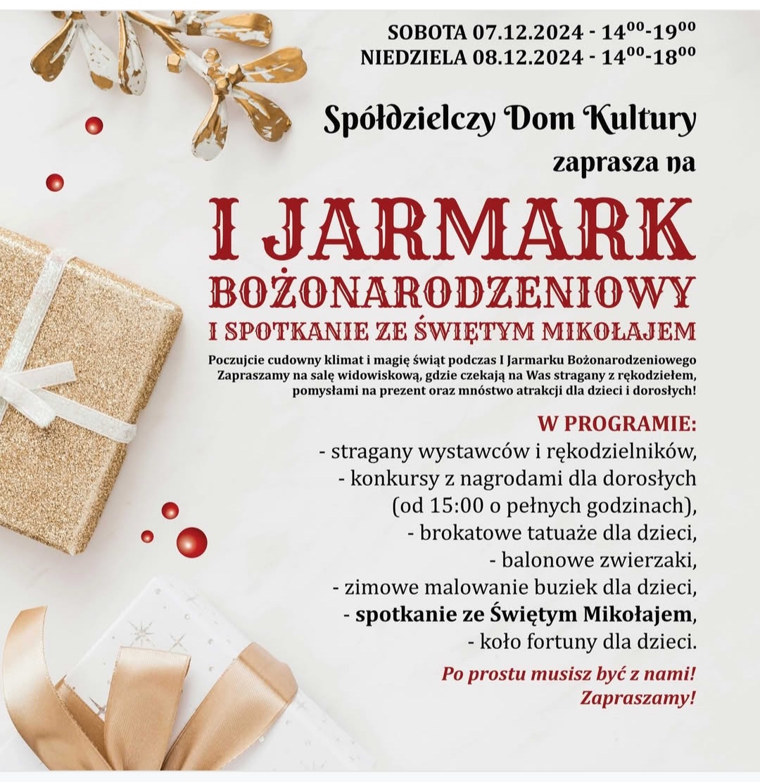 Poczujcie cudowny klimat i magię świąt. Czekać będą stragany z rękodziełem, pomysłami na prezent oraz mnóstwo atrakcji dla dzieci i dorosłych.