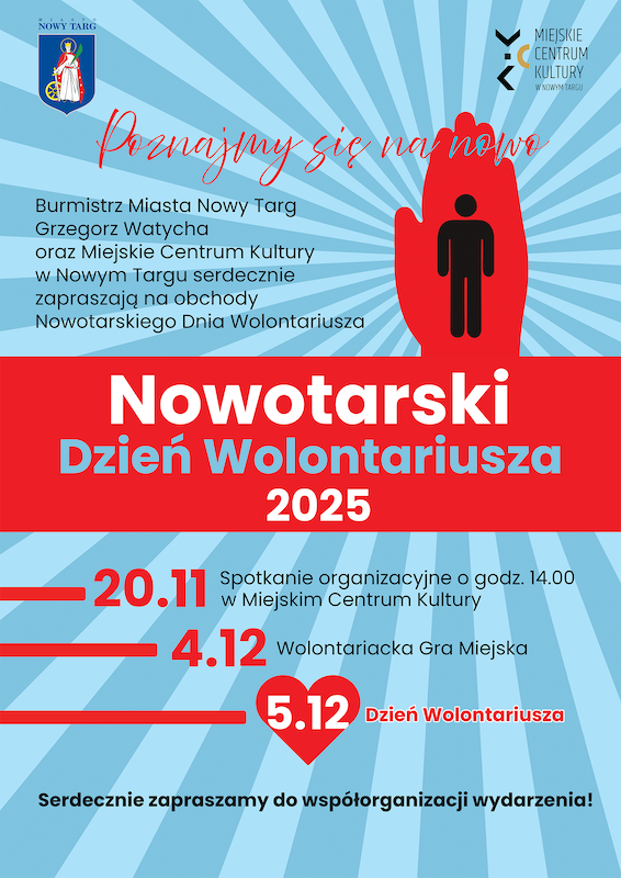 Burmistrz Miasta Nowy Targ oraz Miejskie Centrum Kultury zapraszają na Nowotarski Dzień Wolontariusza