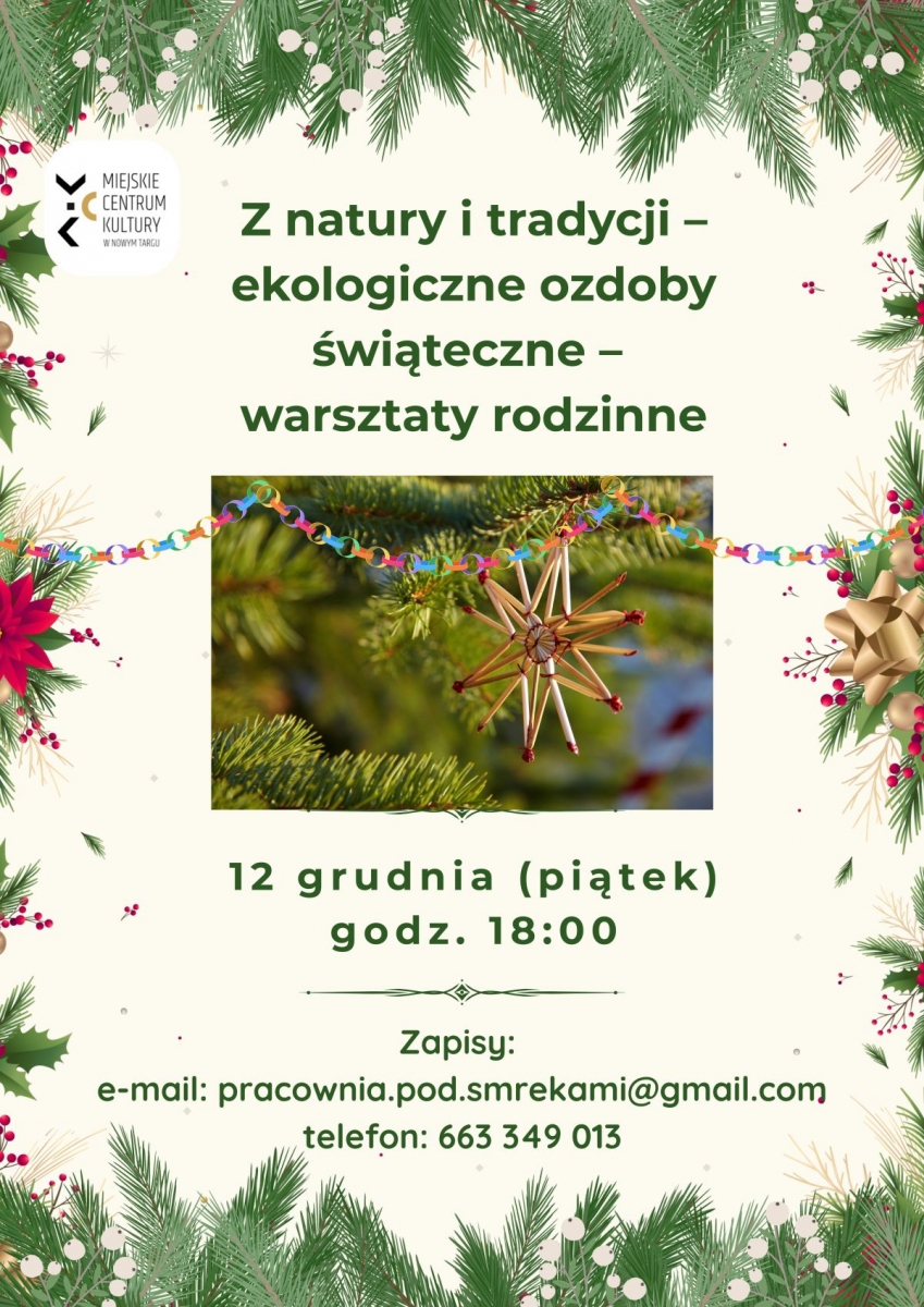 Warsztaty tworzenia tradycyjnych, ekologicznych ozdób świątecznych, odbędą się w piątek, 12 grudnia o godz.18.00 w Miejskim Centrum Kultury w Nowym Targu.