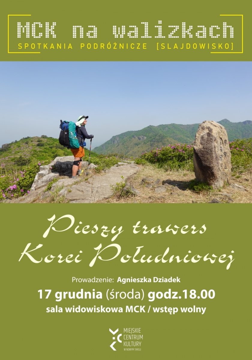 Od małej wysepki Marado na Pacyfiku po posterunek wojskowy na granicy z Koreą Północną prowadziła autorska trasa Agnieszki Dziadek przez Koreę Południową. 1094 km wędrówki było zaskakującą eskapadą przez pustkowia. Z grzbietu pasma górskiego Baekdu Daegan, stanowiącego kręgosłup Korei rzadko widać było cywilizację, a szlaki składały się z samych schodów i zjazdów na linach ze skał. Jedna półka na zapleczu wiejskiej restauracji pełniła rolę sklepu, ale na szczęście z kimchi dało się zrobić kapuśniak. W gęstych lasach kwitły rododendrony, a szamani modlili się przy świętych źródełkach i na kamiennych ołtarzach. W tym z pozoru gęsto zaludnionym kraju udało się poprowadzić dziką i wymagającą trasę pokazującą nieznane oblicze wschodnioazjatyckiego półwyspu.